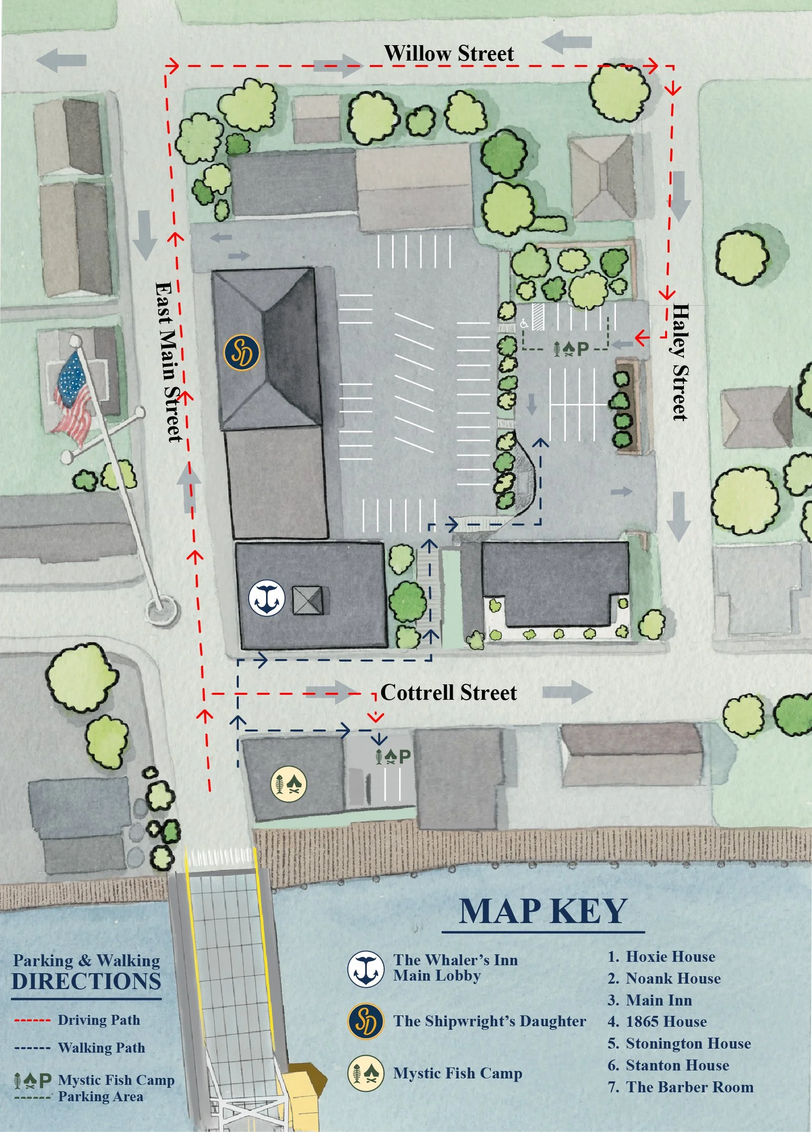 Additional parking is available behind The Stanton House of The Whaler’s Inn, located in the rear (bar back) parking area, during operational hours. This lot is a short walk from Mystic Fish Camp.
